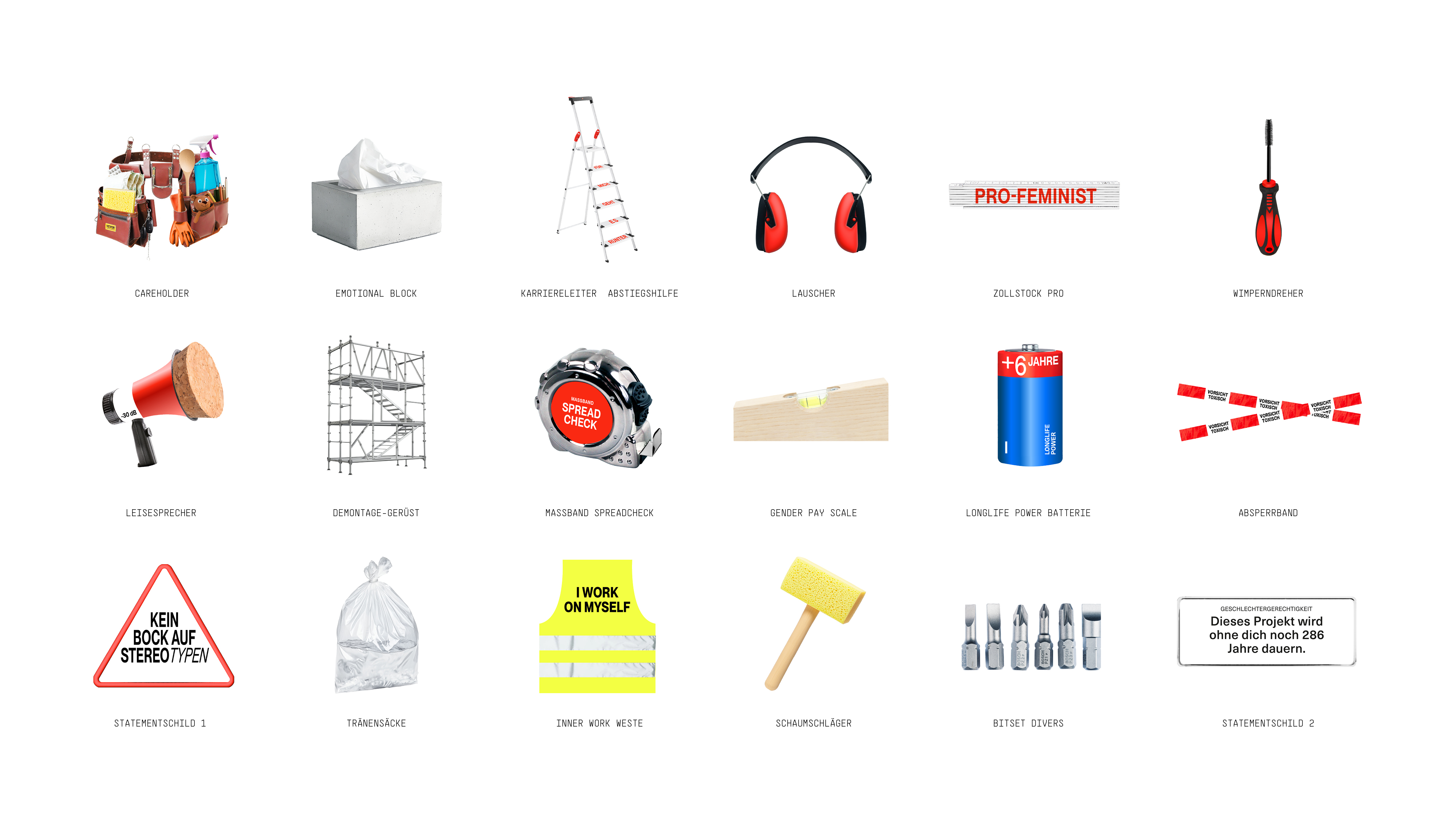 Most men do not see feminism as something that concerns them – and are conspicuously passive when it comes to the fight for gender equality. ‘If men are the ones who “sort things out”, then why don’t they prevent violence against women, challenge assimilated misogyny, or do anything against sexism among their peers?’ asked Louisa Nikolaus. This question became the starting point for her Bachelor thesis, in which she takes up the handyman / DIY masculinity ideal of the 1950s and ’60s and reworks it into a set of tools that convey feminist perspectives to men themselves.